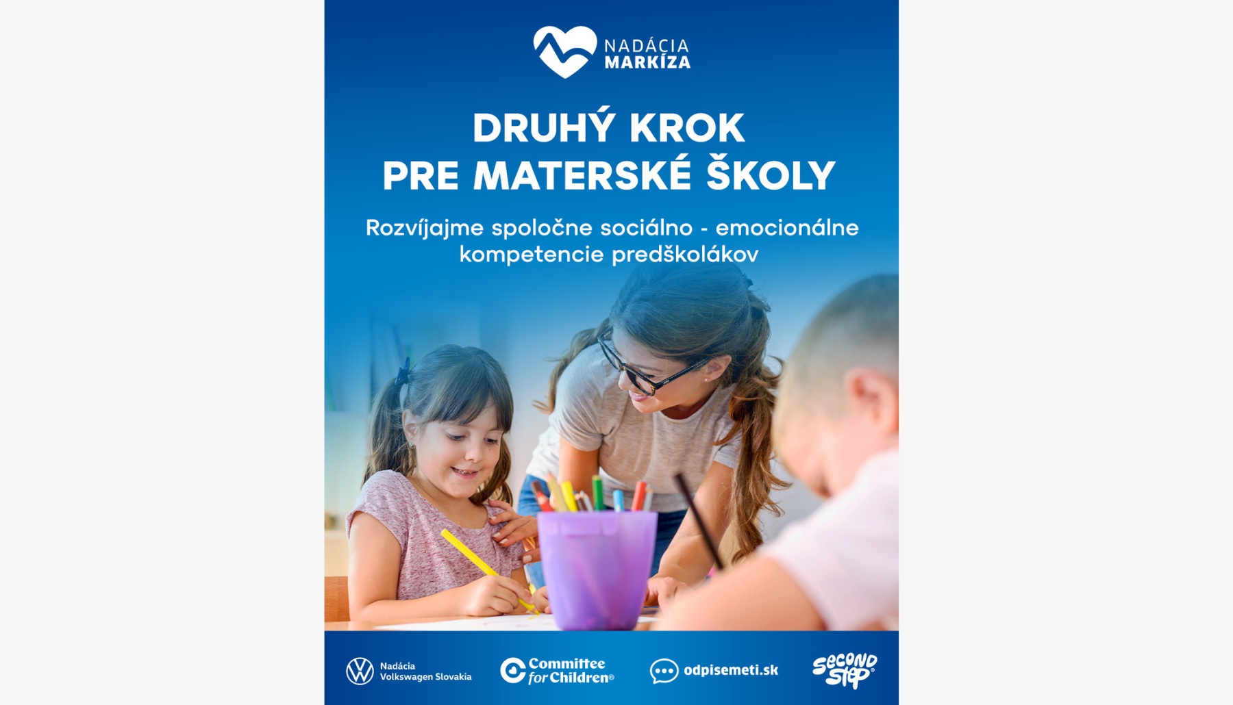 Po pozitívnych skúsenostiach s programom na základných školách posúva Nadácia Televízia Markíza v spolupráci s Nadáciou Volkswagen Slovakia program Druhý krok ešte bližšie k deťom – do materských škôl. Práve v predškolskom veku sa formujú prvé priateľstvá, schopnosť spolupracovať a zdravo riešiť konflikty, preto je podpora sociálno-emocionálneho učenia v materských školách mimoriadne dôležitá.